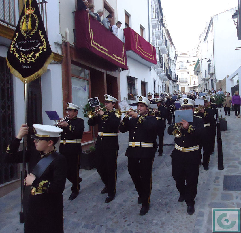 Cruz de guía.Miembros de la hermandad, con el Cristo yacente a hombros.Agrupación Musical del Santísimo Cristo del Calvario.El Cristo yacente en su urna.La procesión, entrando en la calle San Sebastián.Acompañamiento musical, por la plaza de Colón.Acompañamiento musical, por la calle San Sebastián.Penitentes.