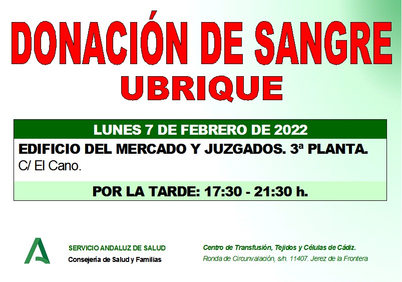 El Centro de Transfusión, Tejidos y Células de Cádiz, con sede en Jerez, ha convocado una nueva sesión de donación de sangre en Ubrique. Será el lunes 7 de febrero de 2022, de 17:30 a 21:30 horas, en el edificio del Mercado y Juzgados (c/ Elcano), 3ª planta.