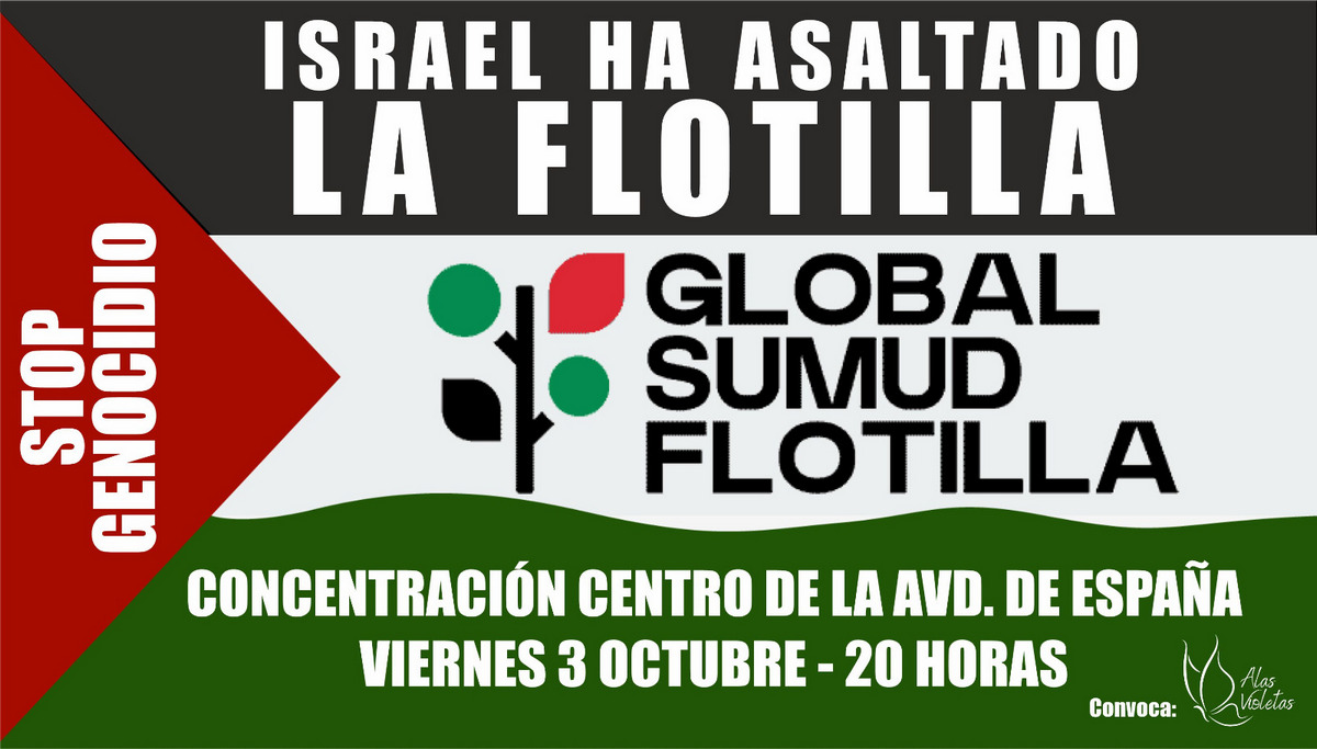 La asociación eco-feminista Alas Violetas de Ubrique ha convocado para este viernes 3 de octubre de 2025, a las 20 horas, una concentración en el centro de la avenida de España para protestar contra el genocidio que el gobierno de Israel está cometiendo contra la población palestina en Gaza. El cartel de la convocatoria informa de que Israel ha asaltado la «Global Sumud Flotilla«, que pretendía llevar ayuda humanitaria a los gazatíes.