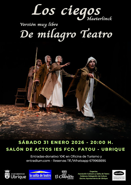La Asociación Cultural La Salita de Teatro, en colaboración con la Delegación de Cultura del Ayuntamiento de Ubrique, ha programado una nueva propuesta escénica pero, en esta ocasión, fuera de su sede habitual. El sábado 31 de enero de 2026, a las 20:00 horas, el Salón de Actos del IES Francisco Fatou de Ubrique acoge la representación de la obra de teatro Los Ciegos, una versión muy libre del texto de Maurice Maeterlinck, a cargo de la compañía De Milagro Teatro. Se trata de «un montaje poético y esencial sobre la espera, la incertidumbre y el amor al teatro».