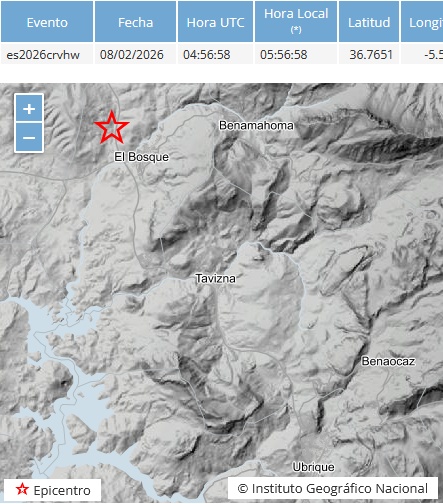 Un terremoto de magnitud 3.6 se registró en las proximidades de Ubrique en la madrugada del domingo 8 de febrero de 2026. Según informó el Instituto Geográfico Nacional, un seísmo de magnitud 3.6 se registró entre Jimera de Líbar y Cortes de la Frontera, junto al límite con la provincia de Cádiz a las 02:43:04 hora local (01:43:04 UTC), en latitud 36.6659 y longitud -5.3185. Vecinos de Ubrique sintieron de madrugada este pequeño movimiento de tierra.